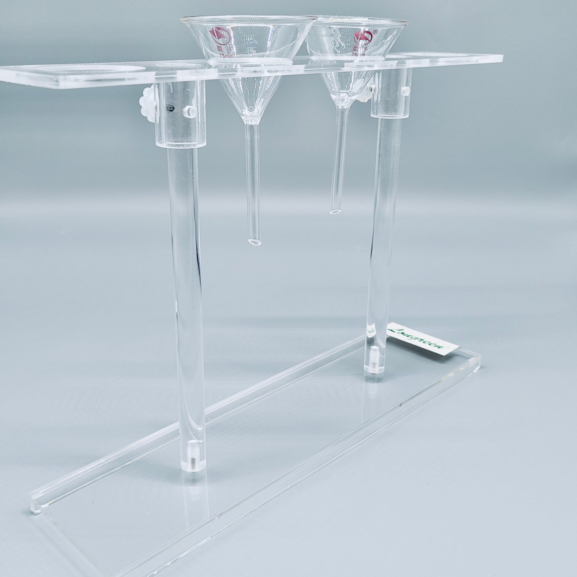 This plexiglass funnel rack is designed for 50 to 75 mm funnels, featuring adjustable height to accommodate different setups. Its easy assembly makes it convenient for quick laboratory organization, ensuring your funnels stay securely in place while optimizing workspace efficiency.